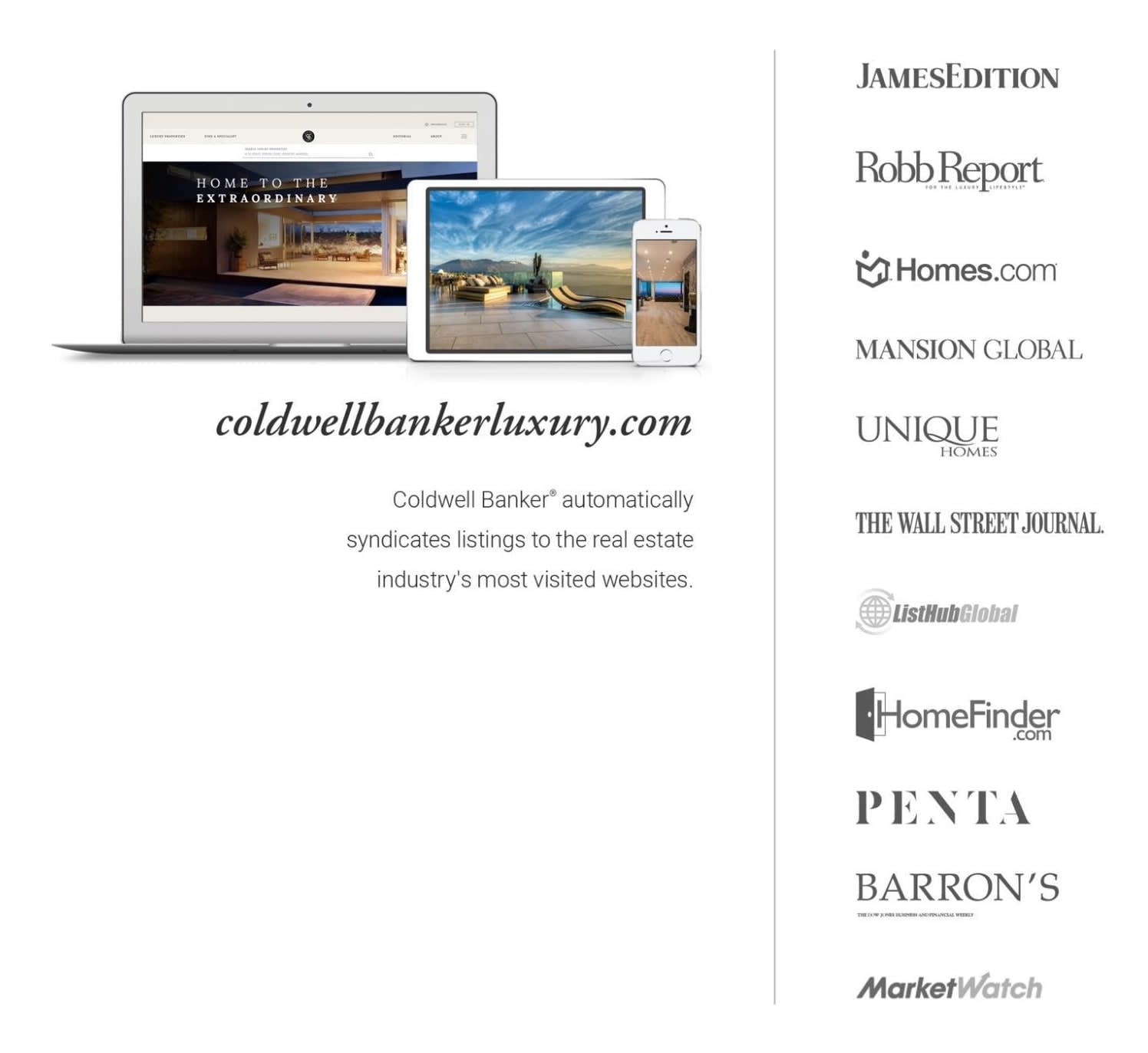 The Coldwell Banker Global Luxury® program has joined forces with some of the world's most exclusive and high-performance real estate syndication websites to maximize the global exposure of your luxury home.
